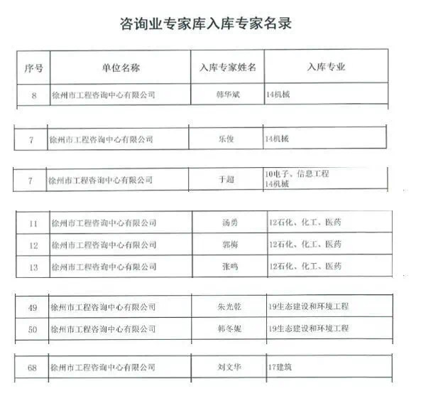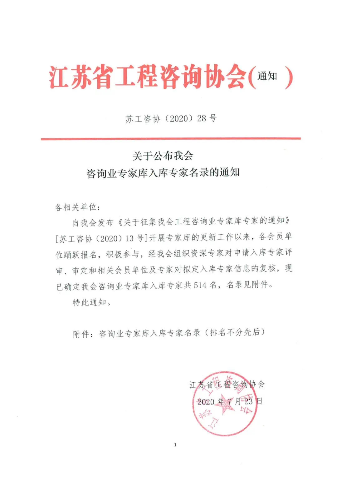 为进一步完善咨询业专家库的建设,更好发挥专家在咨询行业的智囊团和引领指导作用,江苏省工程咨询协会组织建设我省工程咨询业专家库,并在全省范围内征集专家,经省协会组织多名资深专家对申请入库专家评审、审定,我公司共九位专家入选,涵盖机械、建筑、电子、信息工程、生态建设和环境工程、石化、化工、医药等专业领域。九位专家入库代表了行业对我公司专业技术水平的认可,也对我公司提高在行业内的影响力以及开拓经营市场将起到积极促进作用。